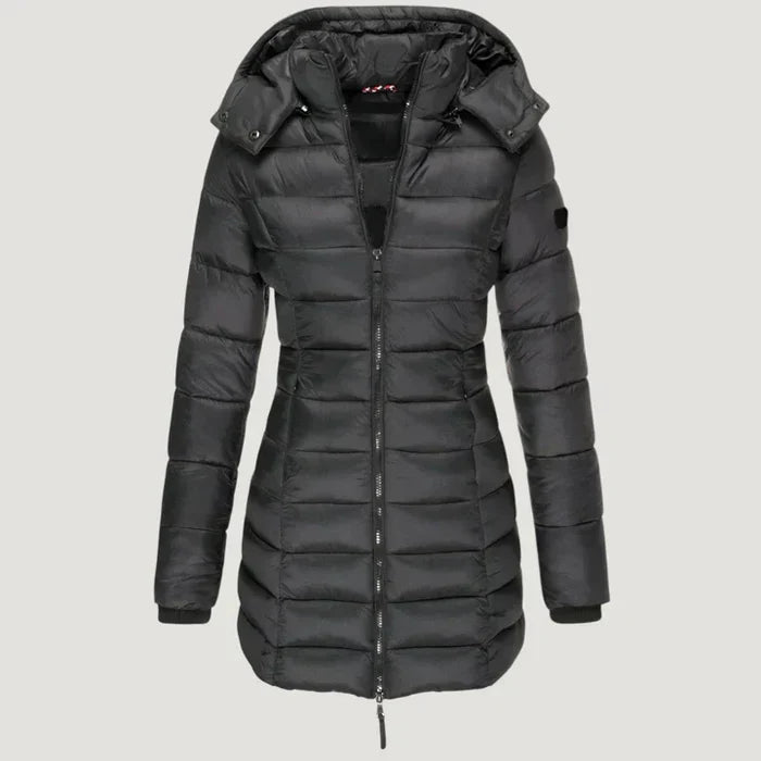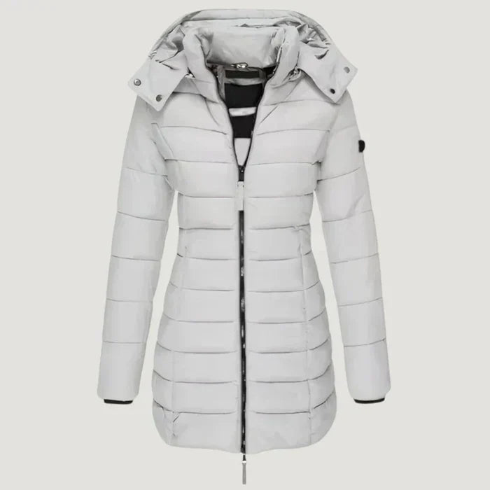 Miękka, lekko połyskująca powierzchnia i starannie dopracowany, taliowany krój podkreślają sylwetkę, zapewniając jednocześnie wygodę i swobodę ruchów. Ciepłe pikowanie otula jak miękki koc, a praktyczny kaptur dodaje poczucia bezpieczeństwa nawet w najbardziej mroźne poranki.