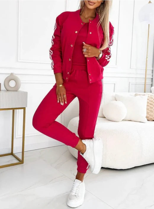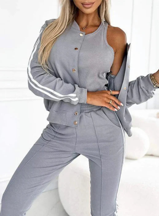 Miękki, oddychający materiał otula ciało niczym druga skóra, a subtelne paski wzdłuż rękawów i nogawek dodają nowoczesnego, kobiecego charakteru. Niezależnie od tego, czy jesteś w biegu, na kawie z przyjaciółką czy odpoczywasz w domu – w Zetii zawsze wyglądasz pewnie i stylowo bez wysiłku.